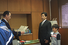本記者・浅井が早速松浦さんにインタビューすると、「ちょうどこの出来事に遭遇する直前に、学科の実技実習で「救急法」を学んだばかりだったんですよ」と、はにかんだ笑顔を見せてくださいました。けれど、心肺蘇生法を体験する講習会に、奥様と揃って過去数回も参加してきた経験もお持ちなのだとか。この行動力が、さすが〜!ですね。表彰式のお写真で拝見する愛息・裕樹君も立派なお顔つきの少年であるし、本当に素晴らしきかな、医療人たるお手本のご家族です。本学園にとっても大きな誇りです。昨今のいやなニュースを吹き飛ばし、柔道整復師をめざす全国の学生さんたちにも大きな勇気を運んでくれる、いやいや本当にステキなニュースでした。パチパチパチパチ!