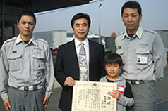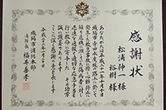 「感謝状 松浦伸一様 裕樹様 あなたがたは平成21年10月10日、城陽市寺田水路坂の路上において発生した救急事故に際し、心肺停止に陥り危機に瀕していた傷病者に対し、迅速な通報と適切な応急手当を行い救命に寄与した。その功労誠に顕著であります。ここに深く感謝の意を表します。平成22年1月20日 城陽市消防本部 消防長 福井善考」