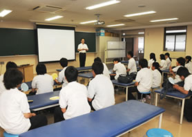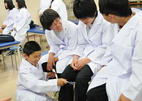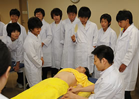 キャリア教育の一環として、松原中学校2年生が本校へ来校されました。医療の仕事に興味があるみなさんへ、体験授業を通してからだの仕組みや不思議を感じてもらいました。ストレッチや、はりのデモンストレーションには興味津々で、あちこちで喚声があがっていました。校舎内の施設や在校生の実習も見学をし、医療の学校の一端を感じてもらえたのではないかと思います。
